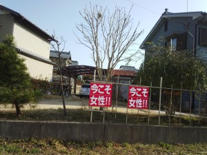 私の家の前にも、高井美穂さんの看板を掲げました。真ん中の木はとちの木、もう10年くらいになります。山で拾った種から育てました。実が成るのに20年くらいかかるそうです。