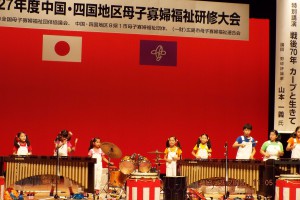 中国・四国地区母子寡婦福祉研修大会の最後のアトラクションです。広島ジュニアマリンバアンサンブルの皆さん、ニューヨーク・香港・ロシア・フランス・中国・台湾・ベトナム・オーストラリアと世界各地で演奏活動をしているのだという。こんな小さな子供たちが一生懸命パイプ木琴や太鼓をたたくのを見ていると、平和を願う広島市民の気持ちが伝わってくる。