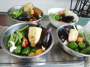 今日は三好市消費者協会で肉料理の講習会がありました。徳島県消費者協会の斡旋なので、人を集めるだけで準備をする必要は全くありませんでした。「アッ、お茶の葉を忘れた」と思っても、お茶の葉まで準備してくれていました。写真は肉料理に使った野菜です。家では、一度にこれだけの種類と量の野菜は使いません。