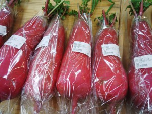 先日の三縄婦人会新年会は上野の「しののめ市」の地下で行われました。道の駅に珍しい赤い大根があったので撮影しました。