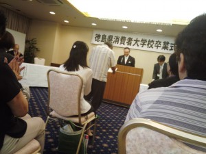 今日は消費者大学の卒業式でした。知事が男性の学生に卒業証書を渡しているところです。「男性も消費者大学に来ています。三好市の男性も参加してください」のつもりです。 以下同文でなく、一人一人に卒業証書を全文読み上げてくれました。
