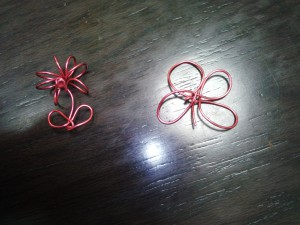 今日はワイワイ食堂へ行ってきました。銀座にある子供のための食堂です。1か月に1回開かれています。子供100円、大人500円です。16時ごろ行くと、まだ準備中で、待っている間に、アルミワイヤーで作る作品を教えてくれました。左が花、右がチョウです。その他にも、動物や自転車まで作れるそうです。子供は10人ぐらい来ていました。一人で来ている子もいました。