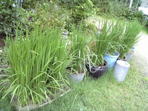 たくさんの稲苗をもらったので、そんなことを夢みながら、バケツ稲を近所の人に勧めてみた。しかし、だれも興味を示さなかった。一人、稲苗がほしいという人がいたので、半分を差し上げ、いただいた半分を全部植えた。容器はすべてもらったり、家にあったものを使い、野菜の土2袋以外は何も買わなかった。庭の土をふるいにかけ、買った野菜の土を混ぜ、多少乾燥させて消毒したつもりになり、20センチの深さにして、7月10日から、1バケツづつ植え、17日にやっとすべてを植え終えた。その後台風が来て、バケツの水はいっぱいになった。(H23.7.23記)