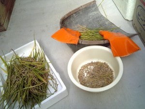 刈り取るのが遅かったため、十分乾いているだろうと思って、干さずに、すぐに、しごきました。