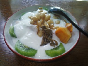 今日の朝食です。自宅で取れた柿とキーウィに自分で作った梅ジャムとヨーグルトをかけ、自分で炊いた北海道産と書かれていた大豆をトッピングし、先日もらったナスとジャコの炒め物が前の黒いものです。