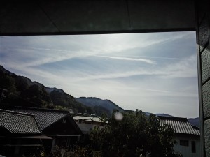 昨日の朝、10時ごろ自宅から見た南の空です。飛行機の姿は見えませんでしたが、あの筋状の雲はケムトレイル散布の雲ではないかと思って写真に撮りました。