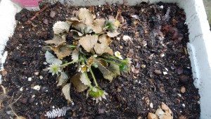 以前写真で公開したイチゴの苗も褐色になりかかっています。実は赤くなっていますが、期待したほど大きくなりませんでした。