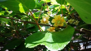キーウィの花です。去年は1個も咲かなかったのに、今年は花盛りです。