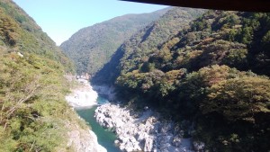 石の博物館、大歩危からの写真です。南北に流れるのは吉野川、遠くに大平氏の休憩所が見えるのですが。