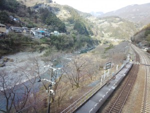 大歩危駅の写真です。吉野川が手前から北に向かって流れています。はげた山の上には人家があります。