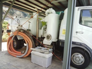 右の写真は久保衛生の側溝などの砂・ジャリを吸い取るバキューム・カーです。脇町などでは使われていますが、三好市では需要がないのだとか。側溝のふたを開けないでも、このようなバキューム・カーで吸い取ることができるのだそうです。床がセメントの川床などに砂・ジャリがたまっているのを掃除している年配の方を見かけます。覚えておいて、必要な時にはどうぞ。