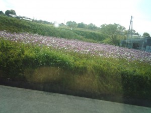 11月3日、香川大学農学部の収穫祭に行ってきました。国道193号線だったかな~コスモス街道を通って帰りました。バスの中から撮ったコスモスです。