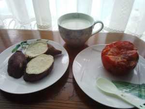 今日の朝食です。柿のzukuと焼き芋と牛乳と甘酒を混ぜた飲み物、甘酒の酵母で牛乳がヨーグルトのようになると思って飲んでいるのですが。