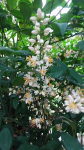 ナンテンの花です。きれいですが、花びらはすぐ散るので、生け花には無理ですね。