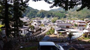 10月16日、お祭りの前の日、準備に行って、とても良い天気だったので、一宮神社からの写真です。左側に参道があり、参道に沿って谷があります。真ん中の家が櫻井さん宅、6年前に1人で住んでいた奥さんが亡くなって、時々息子さんが家を見に帰っているとか。平たく言えば空き家ですが、よく管理されています。