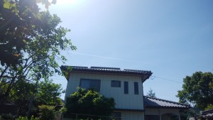 4月30日午前10時19分、ケムトレイル散布の飛行機が空高く飛んでいました。家の屋根の近くにうっすらと一直線の雲が見えるのですが、わかるでしょうか。