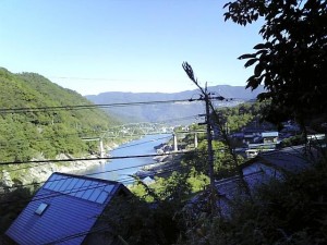 2005年に漆川橋のちょうど漆川から下った場所で撮った写真です。南北に走る吉野川と、そこにかかる鉄橋が見えます。鉄橋には土讃線が走っています。